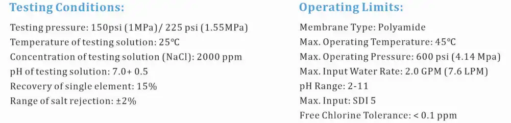 | Permeate Flow GPD(m³/d) | 750(2.84) |